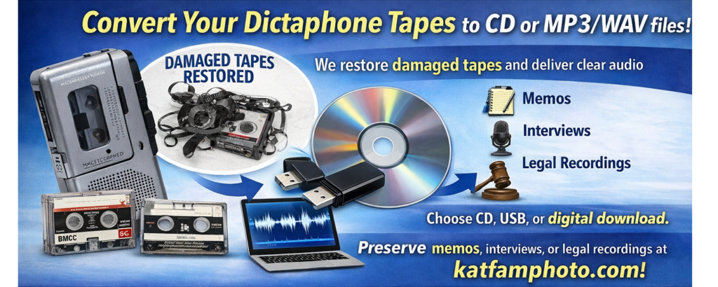 Convert your Dictaphone micro/minicassette tapes to CD or MP3/WAV files! We restore damaged tapes and deliver clear audio in 1–2 days. Choose CD, USB, or digital download. Preserve memos, interviews, or legal recordings at katfamphoto.com!